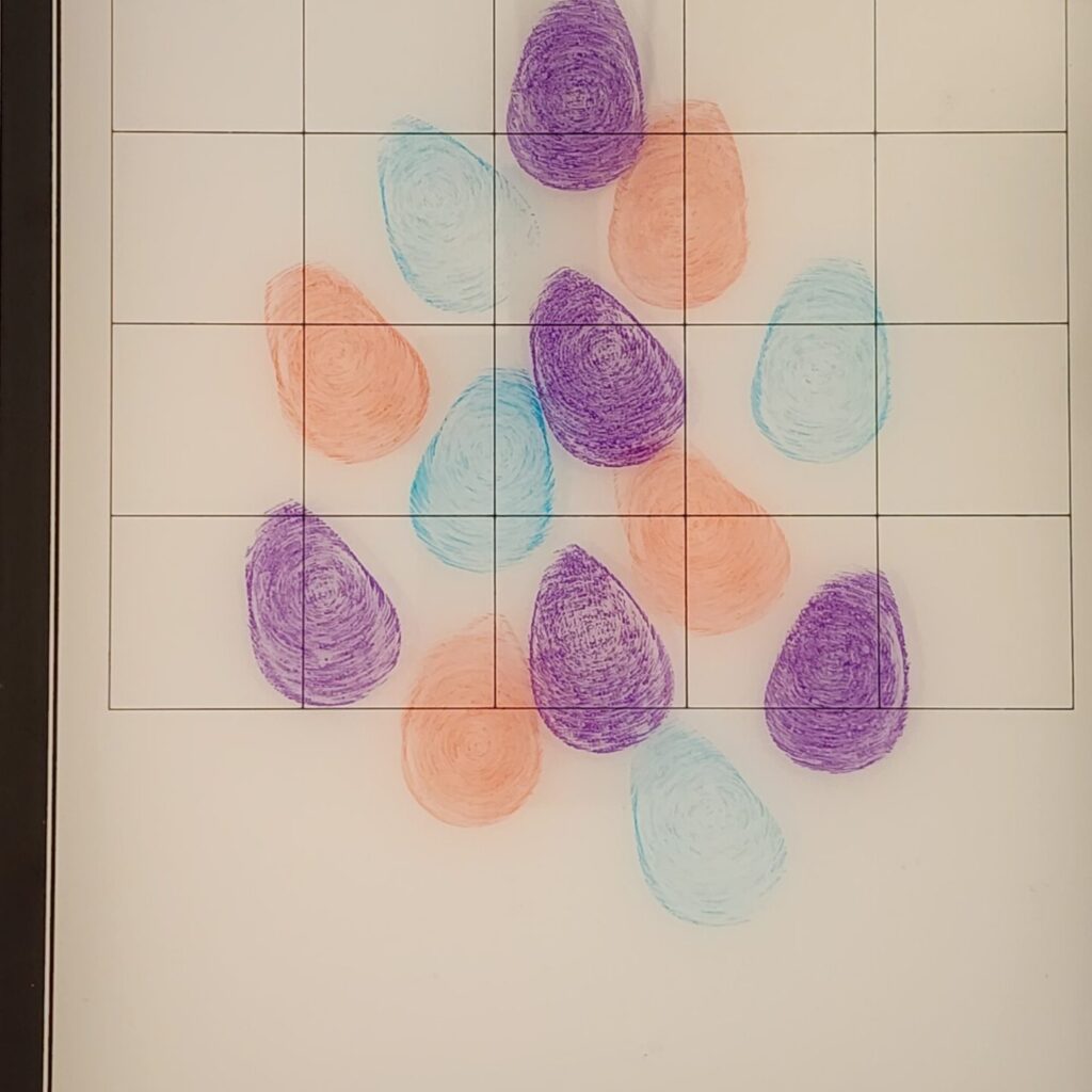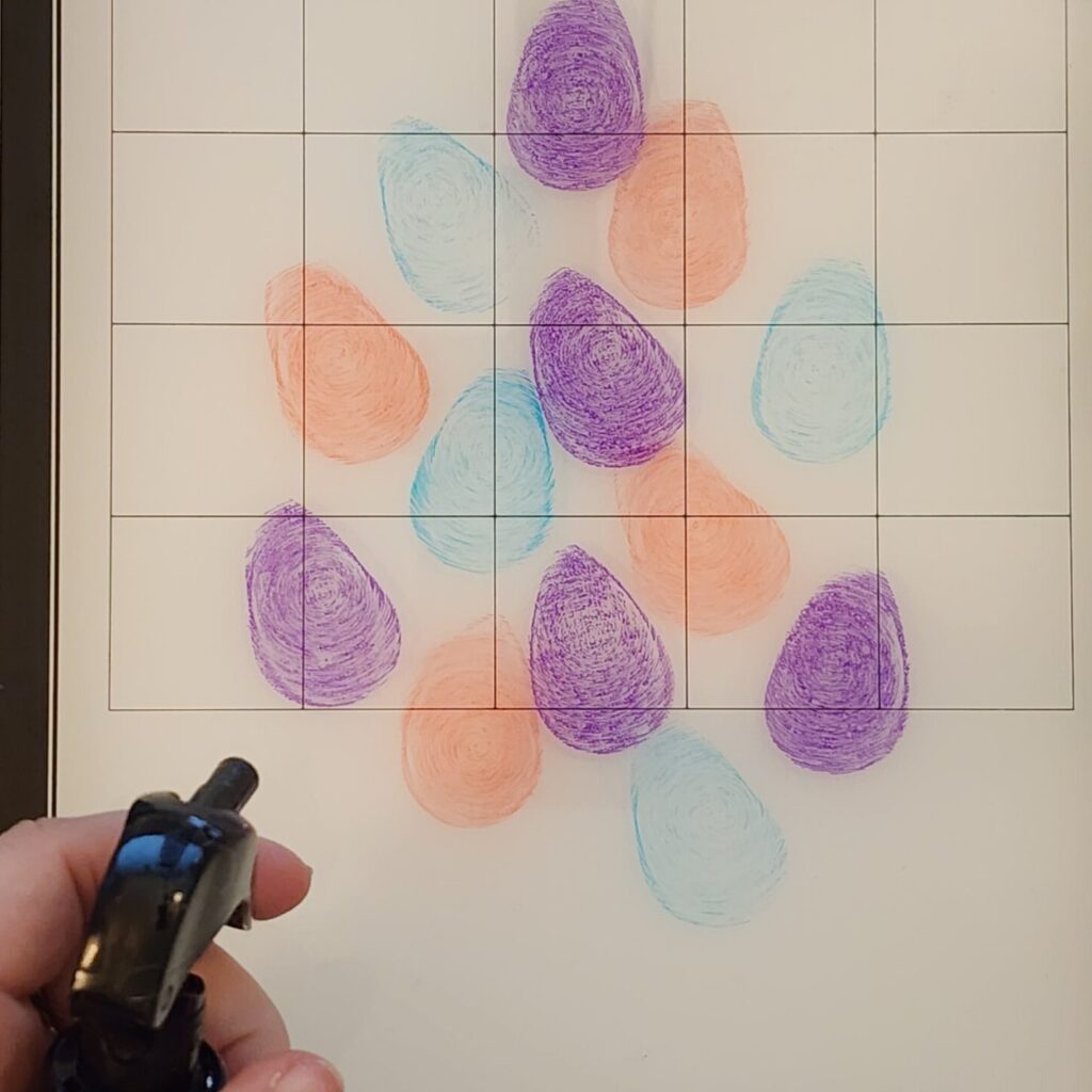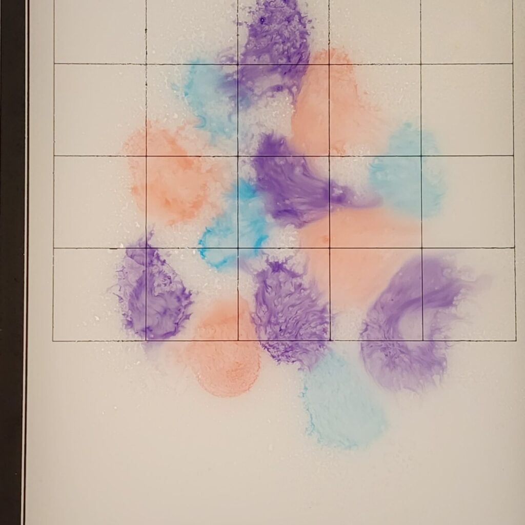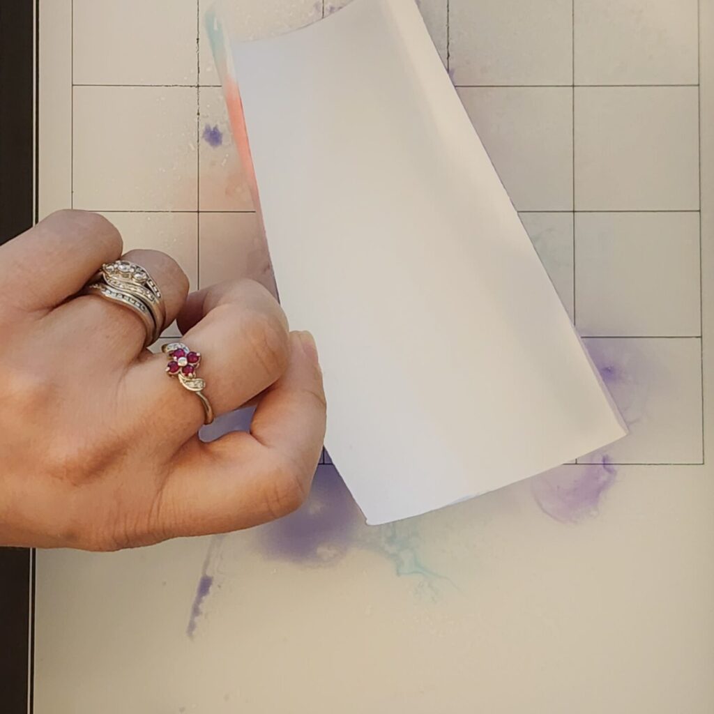 Take your spray bottle and lightly spray water onto the stamp ink. Once you have added the water, take your paper and place it face down onto the ink. You can repeat putting the paper into the ink to cover more of your paper or to mix the colors even more.